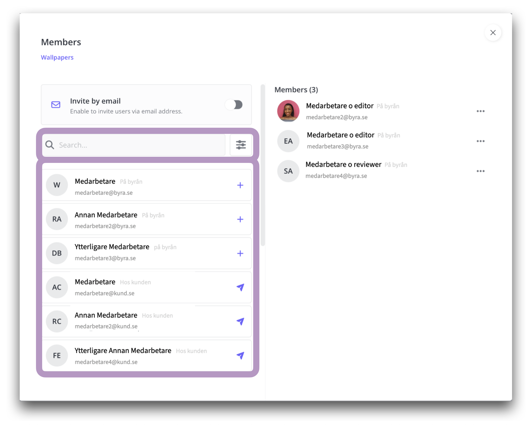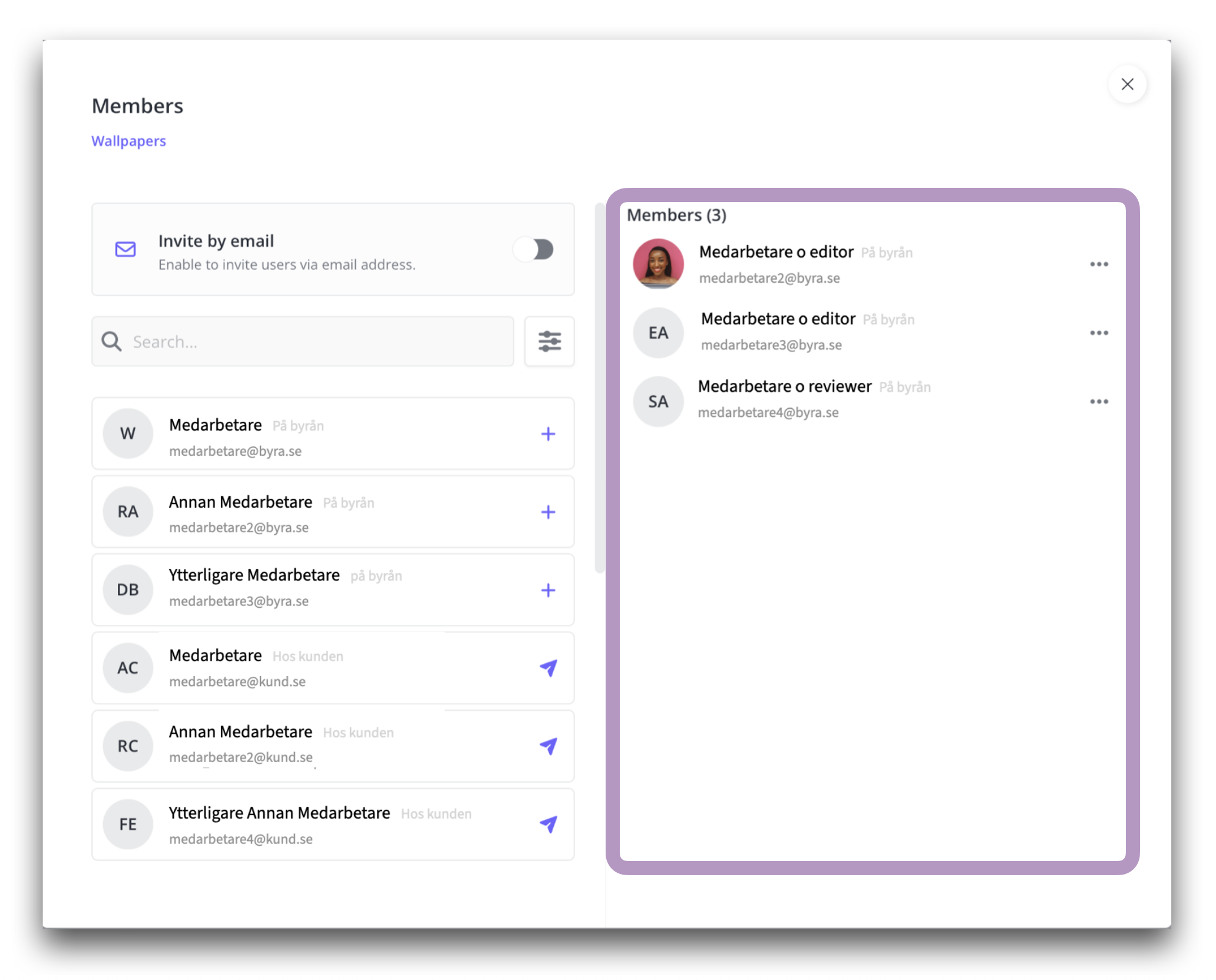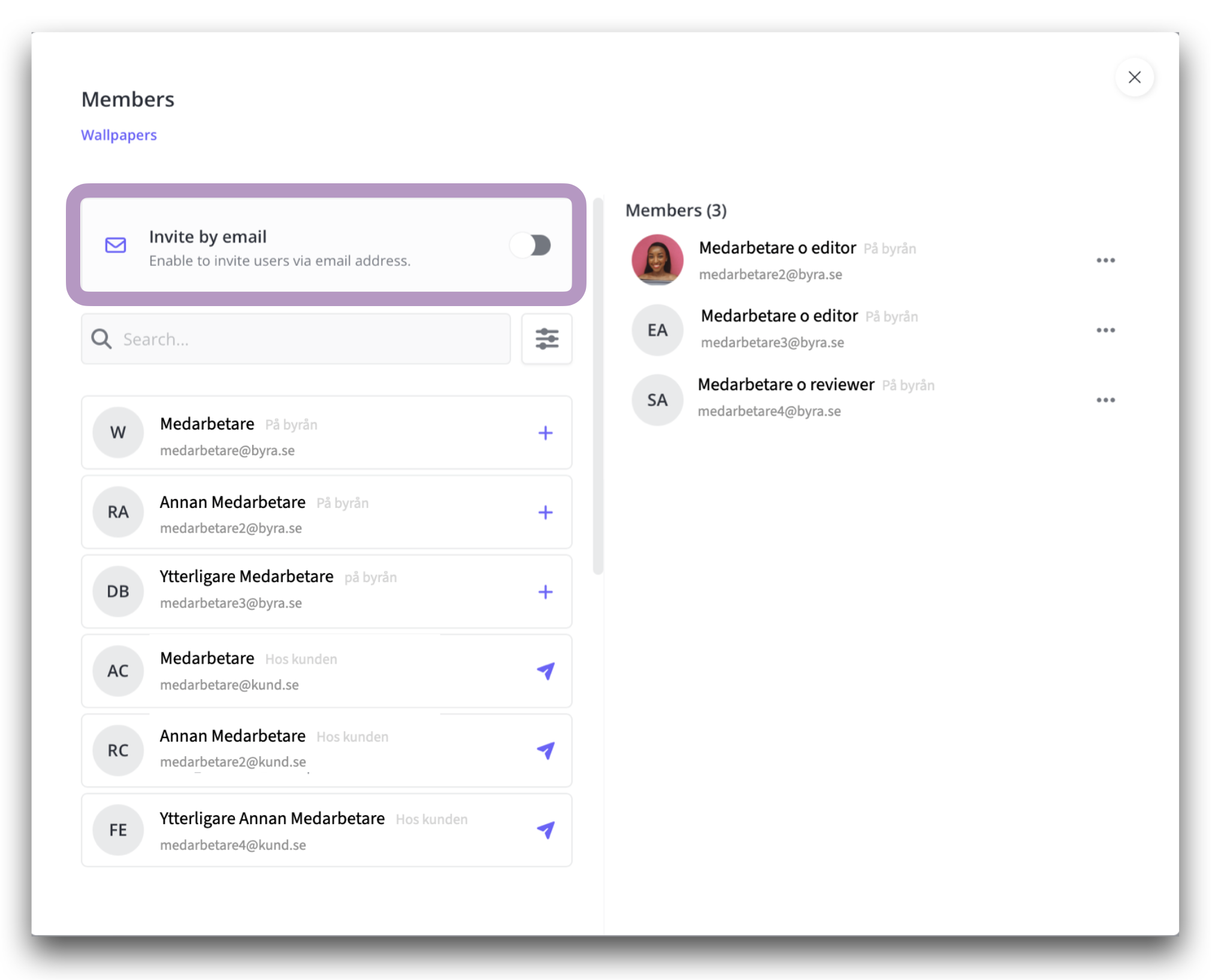 De du bjuder in via projektmodalen hamnar automatiskt även i motsvarande modal för hantering av deltagare i workspace.